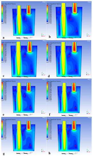 - Among the four types of layouts, the symmetrical layout had the most obvious advantages. Compared to the one-side layout, one-row layout and staggered layout, the circulation flow rate of the symmetrical layout was 61.96%, 42.6% and 33% higher, respectively. Out of the 22 layouts, the 127-87 symmetrical layout was the best of those analyzed, for which the circulating flow rate reached 29.8 m3/h and the area of the blind zone was the smallest and the mixing effect of the molten steel was the best.