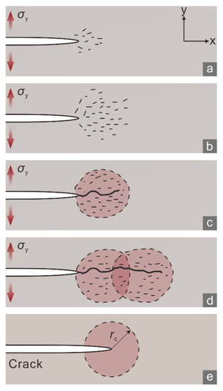 where KIC is the tensile fracture toughness, and rc is the maximum FPZ size. In this context, the FPZ is represented by a circle centered on a fracture tip [14] (Figure 1e), and rc is the radius of a circular FPZ.