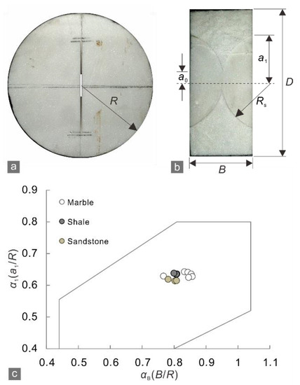 The notched crack of each CCNBD specimen was created by a 1 mm thick circular diamond saw. To ensure cutting accuracy, the expected locations of the circular center and the initial and final chevron notched cracks were marked on each disk. We measured the actual values of the parameters shown in Figure 2a,b and confirmed that the dimensionless parameters α1 and αB of all CCNBD specimens were within the valid range (Figure 2c). The method reported by Fowell et al. [23] was used to calculate the KIC: