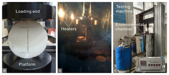 Each CCNBD or BD test (Figure 3a,b) was performed at a constant displacement rate of 0.06 mm/min by an MTS servo-control testing machine (series CMT) with a maximum loading force of 100 kN. This machine is equipped with an SNAS GDS-300 environmental chamber controlled by a WK650 controller (Figure 3c,d). These apparatuses permit environmental temperatures within the chamber up to 200 °C by electrical heaters (Figure 3b). To investigate the effect of temperature, several sandstone specimens were placed in the chamber at 75 or 125 °C for 1 h before the tests began, so that the notched crack propagated within rocks under higher temperatures. Other tests were performed at room temperature (~25 °C). The bedding planes of the shale specimens were set perpendicular (horizontal) or parallel (vertical) to the notched cracks to analyze the effect of the bedding orientation.