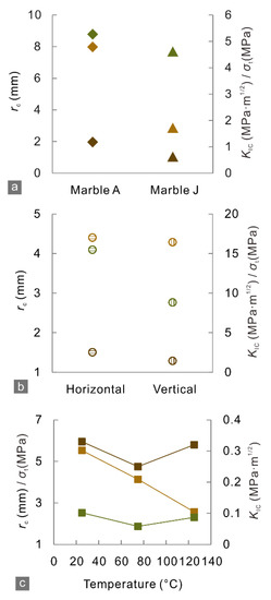 Mean tensile strength (brown), tensile fracture toughness (green), and crack tolerance (sienna) of the (a) marble A (diamond) and J (triangle), (b) shale (circle) with horizontal and vertical orientations and (c) sandstone (square).