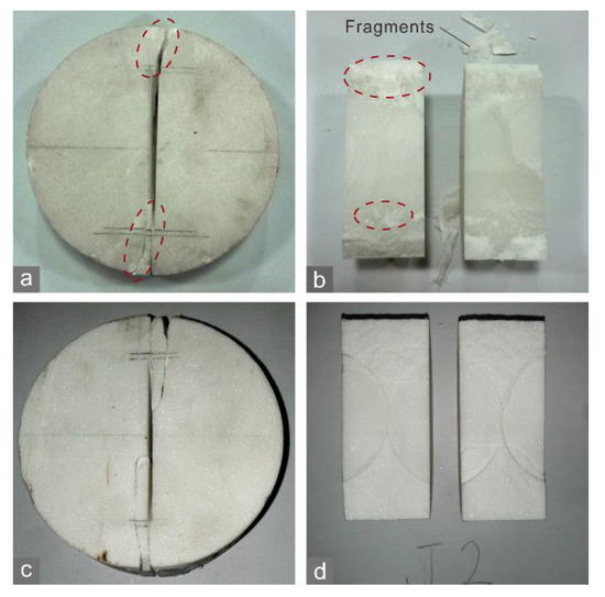 In the CCNBD test, the marble A specimens with stronger heterogeneity had greater tensile strength, fracture toughness, and crack tolerance than the marble J specimens, with relatively homogeneous small grains (Figure 4a). White patches indicating FPZs [25] appeared in front of the notched crack tips (Figure 5a) as the peak loads of the marble A specimens were approached. The patches corresponded to the sparkling areas on the rupture surface (Figure 5b), which may imply breaking cleavages of grains. However, such patches were not observed for the marble J specimens (Figure 5c,d), and neither were the discernible sparkling areas. Furthermore, the main cracks in the marble A specimens had branches causing more fragments (Figure 5b) while the crack in the marble J specimens propagated along a straight path (Figure 5c). These phenomena suggest that a more heterogeneous grain size corresponds to a larger crack tolerance and thus a stronger ability for crack generation.