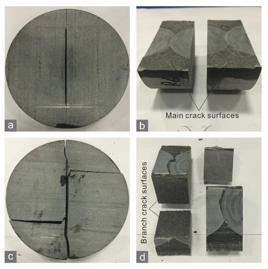 Crack morphologies of the shale CCNBD specimens with (a,b) horizontal and (c,d) vertical bedding orientations.