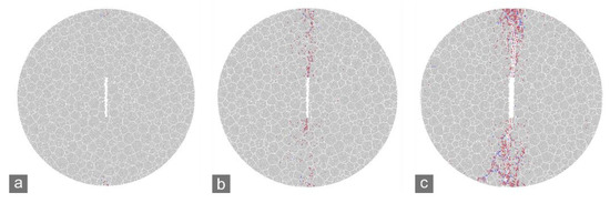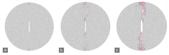 In the numerical simulations of the CCNBD test, when the applied load reached a certain level, micro-cracking was initiated near the notched crack tips of the specimens (Figure 10a and Figure 11a). At the peak loads (Pmax) of the marble A and J specimens, the micro-cracks around the crack tips tended to coalesce to form new macroscopic cracks (Figure 10b and Figure 11b). After that, the notched crack propagated dramatically, which caused a rapid post-peak drop in the applied load and the specimen to rupture (Figure 10c and Figure 11c). Therefore, the preparation stage for dramatic propagation of a notched crack can be defined as from the initiation of micro-cracking to the reaching of the peak load, during which micro-cracks generate to develop the FPZ. The FPZ is the area near the crack tip with a dense micro-crack distribution when the peak load is reached that stays in the critical state of macroscopic rupture. As mentioned in Section 2, the crack tolerance is characterized by the size of the FPZ.