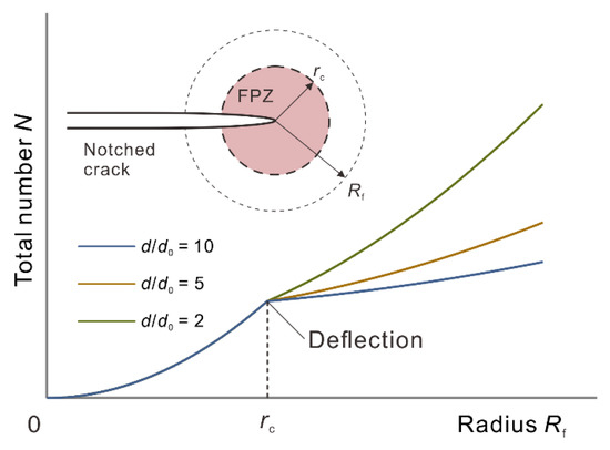 where d and d0 are the average micro-crack density inside and outside the FPZ, respectively. N displayed a positively correlation with Rf; however, the curves of N deflected when Rf increased to rc that defined the boundary of the FPZ (Figure 12). This is because the micro-crack density d inside the FPZ can be up to ~15 times as great as the background density d0 [36]; the increasing rate of N will decelerate once the statistical range extend outside the FPZ. Such a deflection became more identifiable with the increasing ratio of d/d0. Thus, the crack tolerance of the specimens can be determined by the radius corresponding to the deflection point.