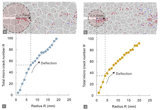 As the above calculation predicts, the micro-crack number N in Figure 10b and Figure 11b for the marble A and J specimens increased with Rf, and the N–Rf curves deflected at radii of 7 and 4 mm, respectively (Figure 13), which were closed to the mean values of the crack tolerance of A (~8 mm) and J (~3 mm) measured by experiments. These results demonstrate that calculating the crack tolerance using the tensile fracture toughness and average tensile strength in Equation (3) leads to reliable results. The simulations also showed that marble A had a greater crack tolerance than marble J, and the FPZ of the former contained more micro-cracks than that of the latter preceding specimen rupture (Figure 13c,d). Correspondingly, the GBM of marble A generates 1473 micro-cracks in the whole loading process, more than that of marble J (1404). These results showed that a greater crack tolerance can represent a stronger ability to generate micro-cracks.