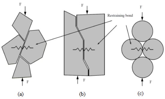 Numerical simulation is alternatively used to investigate some dynamic and complicated problems that cannot be addressed experimentally [14,15,16,17]. DEM, treating the brittle materials as a solid specimen with arbitrarily sized spherical elements bonded together with the assistance of the BPM (Bonded Particle Model), can model mechanical behaviour subjected to external force or moment, which are mainly governed by the formation, propagation and eventual intersection of cracks [13]. Figure 1 shows a comparison of the formation of cracks between a solid specimen constructed with BPM and a real target material. Physical cracks between and inside grains in a real target material occur once a large enough force or moment is applied to the target material as shown in Figure 1a,b, respectively, while similar breakages (cracks) also occur among the spherical elements in a solid specimen, as shown in Figure 1c. Many such cracks would occur inside a solid specimen that contains thousands of bonded spherical elements to represent the cracking process in brittle materials, especially for RB-SiC ceramic which is made of bonded grains by the addition of enhanced materials at given temperatures. Jiang et al. [18,19,20] employed DEM to model SiC ceramics, and explored the crack propagation and failure mode by simulating uniaxial compression and three-point bending tests. Zhang et al. [21] modelled ultrasonic-assisted scratching of alumina ceramic using DEM, and found that the crack initiation was restricted by the addition of compressive stress on the target during the machining process. However, these studies did not consider the different grains in the ceramics, such as RB-SiC ceramic which is mainly made of bonded SiC and Si grains, and the propagation of cracks inside and along these grains, namely, the intergranular and transgranular fractures, during the machining process. Thus, a more accurate model considering the effect of the different grains inside RB-SiC ceramic on the material removal process has been developed in this paper to represent the scratching process more realistically.
