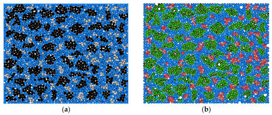 (a) A solid specimen with different clusters (black, grey and blue spherical elements represent the SiC grain, Si grain and cementitious materials, respectively), and, (b) the parallel bonds in different clusters (green lines represent the parallel bonds in SiC grains and red lines represent the parallel bonds in Si grains).