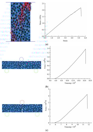 Since the major material properties, such as Poisson’s ratio, bending strength, Young’s modulus and fracture toughness, dominate the mechanical behaviours of RB-SiC ceramic in the material removal process during the machining process, it is first necessary to validate these macroscopic properties of the target solid specimen constructed in Section 2.1, and one of the most critical steps in PFC2D modelling is the calibration of input microscopic properties for the spherical element and parallel bond in different clusters, as given in Table 1.