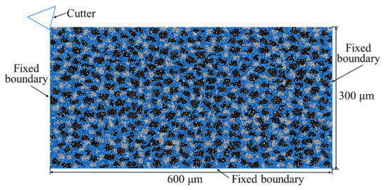 The geometry of the solid specimen, i.e., RB-SiC ceramic, was modelled as shown in Figure 5, where the top face of the specimen that would be scratched by a cutter was set as free, and the other three faces were set as fixed boundaries. In order to eliminate the specimen size effect on the simulation results, specimens with three different dimensional sizes were tested at a scratching speed of 20 m/s and cutting depth of 5 μm by using a rigid cutter with a cutting-edge radius of 1μm, a negative rake angle of 15° and a clearance angle of 30°, and then the total number of cracks and maximum depth of subsurface damage were measured, as given in Table 3. It was found that when the model dimensions were varied from 500 × 250 μm2 to 800 × 400 μm2, there was no obvious change in terms of the total number of cracks and the maximum depth of subsurface damage, such that the solid specimen with the dimension of 600 × 300 μm2, consisting of 13,079 spherical elements, was selected for the following simulations to achieve an accurate solution and reduce the computation time.