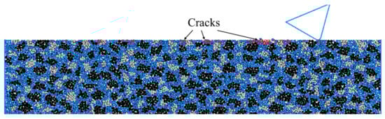 where E, KC, H are the Young’s modulus, fracture toughness and hardness of the target material, respectively, and ψ is a constant which is usually valued at 0.15. By substituting the material properties of the RB-SiC ceramic, as given in Table 2, into Equation (5), the critical depth affecting the ductile–brittle transition of the RB-SiC ceramic in the material removal process was obtained, which was about 0.1 μm. As such, a scratching test on the modelled solid specimen was conducted with a scratching speed of 10 m/s and cutting depth of 0.1 μm by using a rigid cutter with a cutting-edge radius of 5 μm, a negative rake angle of 15° and clearance angle of 30°, and the surface/subsurface morphology is shown in Figure 6. It was found that only limited cracks (a total number of 46) were exposed around some spherical elements which were not detached from the target surface, and by repeating the scratching process with this critical depth of cut, these spherical elements with cracks around them would easily detach from the target surface, resulting in material removal without the formation of obvious median or lateral cracks in the target subsurface. Thus, it may be deduced that this is a ductile material removal mode in the scratching of RB-SiC ceramic.