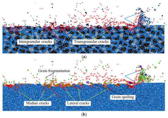 Moreover, the real brittle material removal mode in the scratching of RB-SiC ceramic is somewhat similar to that shown in Figure 7, where this test was conducted on the solid specimen with a scratching speed of 20 m/s and cutting depth of 1 μm by using the same cutter as above. It was found from the surface morphology that the detachment of spherical elements from the target was attributable to the initiation, propagation and intersection of cracks formed by the large contact force between the cutter and workpiece. To be specific, these cracks occurred both inside and along the cluster boundaries with the corresponding transgranular and intergranular cracks of RB-SiC ceramic, respectively, as shown in Figure 7a. It is also interesting to note from Figure 7b that the median cracks generally propagated perpendicularly, deep into the target, while some of the lateral cracks propagated parallel to the target surface, and some propagated to the target surface and interacted with other surface cracks resulting in material removal from the workpiece. To be specific, the green spherical elements represent material removal in terms of grain fragmentation, which is mainly caused by intergranular cracks, while the spherical elements of other colours, except blue, represent material removal in terms of grain spalling that is primarily caused by transgranular cracks. Therefore, the grain-based DEM model can be properly employed to represent the scratching of RB-SiC ceramic by identifying the different material removal mechanisms, such as the ductile and brittle material removal modes, and it can also be used to observe the dynamic initiation, propagation and, eventually, interaction of cracks occurring both inside and along the grain boundaries, which is hard to observe by experiments, such that numerical simulation with the grain-based DEM model is an effective and viable alternative method for evaluating the surface integrity in the scratching of RB-SiC ceramic.