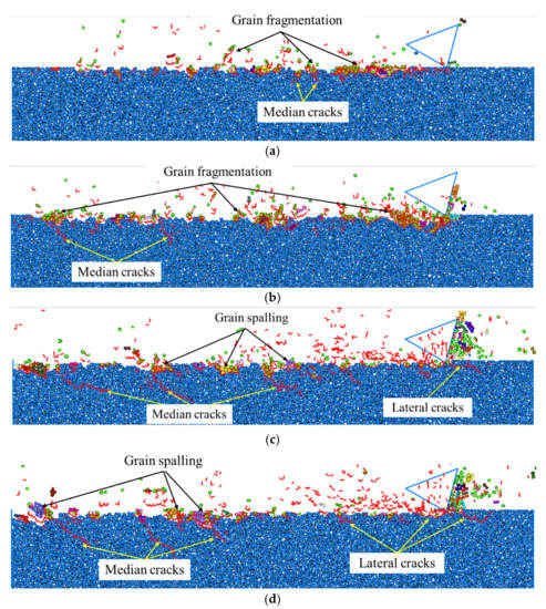 It can be seen from Figure 8, that with the same depth of cut and cutting-edge radius of cutter, the surface/subsurface morphologies under different scratching speeds were significantly different. As can be observed from Figure 8a, when the scratching speed was 5 m/s, a large number of median cracks propagated to the target subsurface, while most of the lateral cracks propagated along the grain boundaries to the target surface, resulting in large grain spalling from the target surface, and leaving a relatively rough scratching surface. With the increase in the scratching speed to 10 m/s, the remaining large grain spalling dominated the material removal process, which was mainly caused by the interaction of lateral cracks, leading to typical transgranular fracture on the target surface, as shown in Figure 8b. However, with the further increase in the scratching speed to 20 m/s, as noted in Figure 8c, some of the lateral cracks could not propagate to the target surface but propagated parallel to the target surface, which did not cause material removal from the target. In this situation, the intergranular cracks propagating through the grains dominated the material removal in terms of grain fragmentation with a small amount of small grain spalling, by which a relatively smooth scratching surface was obtained. When the scratching speed increased to 30 m/s, the resultant grain fragmentation caused by the intergranular cracks with the small amount of small grain spalling still dominated material removal from the target surface, as can be seen from Figure 8d; in particular, the material removed in front of the cutter rake face was mainly by grain fragmentation. However, it was also interesting to notice that the overall length of median cracks on the target subsurface significantly decreased.