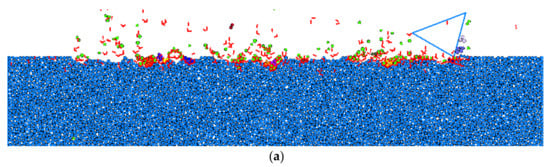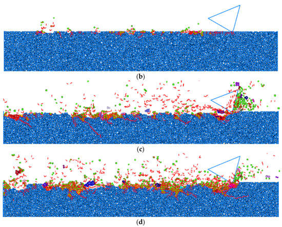 Surface/subsurface morphology after the scratching process under different cutting-edge radii of the cutter: (a) vs = 20 m/s, hs = 0.2 μm and R0 = 1 μm; (b) vs = 20 m/s, hs = 0.2 μm and R0 = 5 μm; (c) vs = 20 m/s, hs = 1 μm and R0 = 1 μm; (d) vs = 20 m/s, hs = 1 μm and R0 = 5 μm.