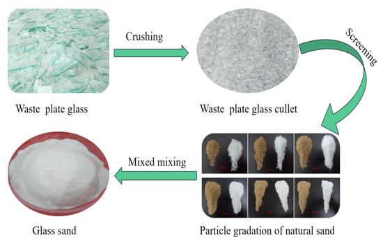 The waste glass particles used in the test were obtained by processing colorless and transparent flat glass, which has a uniform texture and irregular shape, to be closer to the apparent properties of natural river sand. The waste glass sand was prepared by sieving and mixing the waste glass particles according to natural river sand’s particle distribution and fineness modulus. The waste glass sand preparation process is shown in Figure 2.