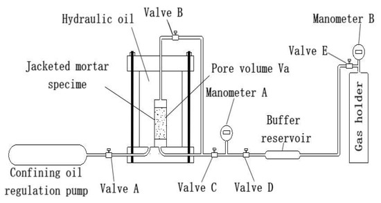 The test device used was a gas–liquid permeation system (Figure 3). It is mainly composed of gas injection system, confining pressure chamber and HDH100-4 servo machine. The limit gas permeability measured by the device is 10−22 m2, and the maximum confining pressure is 60 MPa [38,39].