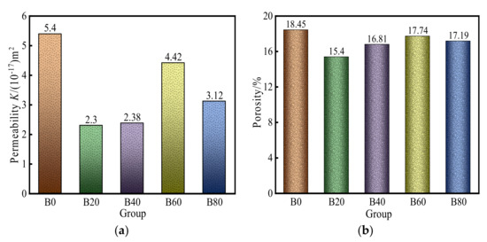 where K is the gas permeability coefficient (m2); μ is the argon viscosity coefficient (Pa·s); h is the height of the specimen (mm); A is the cross-sectional area of the specimen (m2); Pa is the pressure value at the outlet end (0.1 MPa).