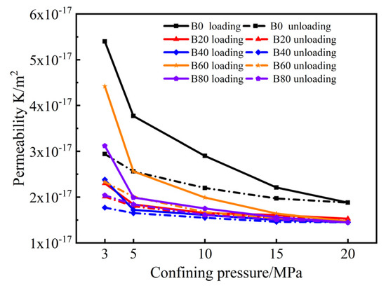 The variation in the gas permeability of mortar with the confining pressure for each replacement is shown in Figure 5. The gas permeability of the specimens decreased by 30.2%, 20%, 27.7%, 42.3%, and 36.2% when the confining pressure loading from 3 MPa to 5 MPa. The gas permeability decreased by 23.1%, 10.3%, 11.4%, 22.3%, and 12.1% when the confining pressure loading from 5 MPa to 10 MPa. The gas permeability of the specimens decreased by 23.8%, 2.4%, 6.8%, 17.6%, and 10.9% when the confining pressure loading from 10 MPa to 15 MPa. The gas permeability decreased by 14.9%, 1.2%, 3.3%, 10.4%, and 7.1% when the confining pressure loading from 15 MPa to 20 MPa, respectively. It indicated that the rate of decrease in gas permeability for all specimens was the fastest when the confining pressure loading from 3 MPa to 5 MPa. At the initial loading of the confining pressure, the pores inside the specimen were the most relaxed, and there were more paths for gas permeation, so the gas permeability of the specimen at this stage decreased enormously. With the continuous loading of the confining pressure, the pores inside the specimen were squeezed, and the pores became narrowed and clogged. Furthermore, the gas permeability decreased more slowly when the confining pressure loading reached to a higher value, which indicated that a threshold value in the process of gas permeability changed with the confining pressure. The influence of confining pressure on the gas permeability was significant, and the gas permeability showed a gradually decreasing trend with the increase of confining pressure.