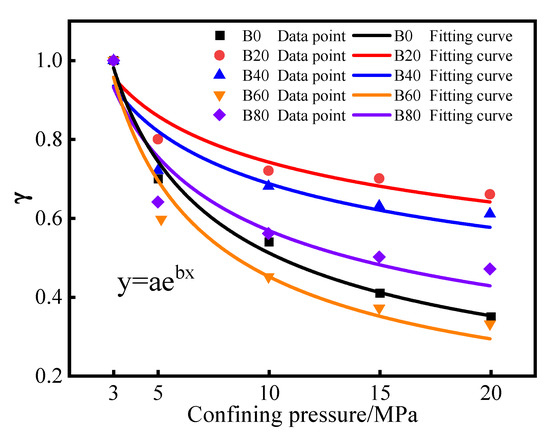 In Table 2, the parameters of the fitted mortar are dimensionless permeability. b is the gas permeability confining the pressure-sensitivity coefficient, and the magnitude of the absolute value of b affects the trend of the fitted curve. The larger the absolute value of b, the more precipitous the fitted curve, and the greater the confining pressure sensitivity. Conversely, the fitted curve is flatter the smaller the confining pressure sensitivity.