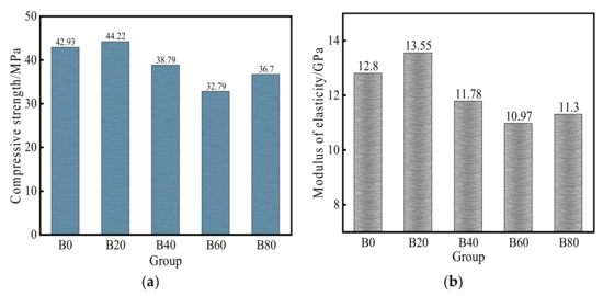 Compressive strength and elastic modulus of mortar for each replacement: (a) compressive strength; (b) elastic modulus.