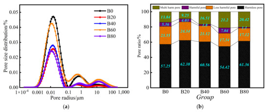 Pore size distribution and pore space distribution as a percentage: (a) pore size distribution; (b) pore space distribution as a percentage.