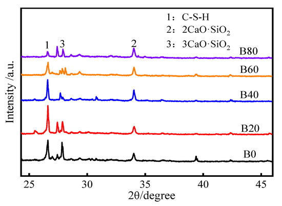 Calcium–silicate–hydrate (C–S–H) is the main product of the hydration process of silicate cement, and the source of the strength of silicate cement [41], dicalcium silicate (2CaO-SiO2) and tricalcium silicate (3CaO-SiO2) are the meta-components contained in the raw material of cement. Figure 12 shows the XRD pattern of the hydration products of mortar, from which it can be seen that the peak angle of C–S–H gel is 26.5° and that the peak angles of 2CaO-SiO2 and 3CaO-SiO2 are about 34°, and 27.85°. It can be found that the intensity of the C–S–H crystalline gel diffraction peak of group B20 is significantly higher than that of group B0. 2CaO-SiO2/3CaO-SiO2 was relatively weaker. The relative content of C–S–H gel, the main hydration product of mortar, increases at 20% replacement. Then it shows a gradual decrease with the increase of waste glass sand replacement, and 2CaO SiO2/3CaO-SiO2 decreased gradually with the replacement of waste glass sand. This indicates that, after the replacement of waste glass sand, the water absorption of waste glass sand was lower than that of natural river sand. The degree of hydration reaction was more intense at the early stage of mortar maintenance. At the same time, the volcanic ash effect of waste glass sand is more obvious in the alkaline cement paste environment. The hydration reaction of SiO2 in waste glass sand with alkaline material Ca(OH)2 produces C–S–H gel, which improves the internal compactness of mortar and improves the internal microscopic pore structure [42].