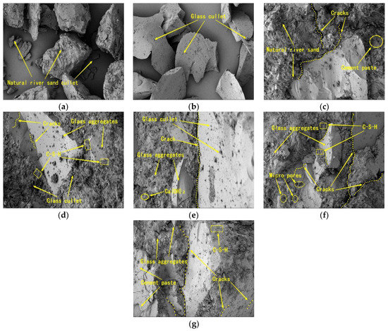 A scan of the 20% replacement is shown in Figure 13d, and it can be seen that the intersection of waste glass sand and cement paste was denser at this replacement. Almost no gap was produced. More C–S–H gel was produced at the intersection, thus inhibiting the ASR reaction and restricting the dilatation of the cement paste. A small number of microcracks were generated inside the waste glass sand. This was attributed to the extrusion during the fabrication process. The large glass particles inside the original microcracks provided favorable conditions for the formation of ASR gels. Because it was difficult to diffuse the microcracks in small spaces where dissolved silicon and sodium ions existed, leading to higher concentrations of silicon, sodium, and calcium [45]. In Figure 13e–g, the bonding between cement paste and waste glass sand decreased with the increase of waste glass sand replacement compared to the 20% replacement, due to the smoother surface texture of glass particles.