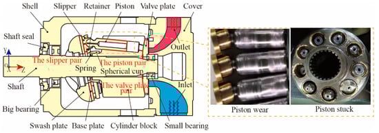 Hydraulic transmission systems have been widely utilized in the aviation, aerospace, and marine industries, with the advantages of high power density and output efficiency [1,2]. Axial piston pumps are the key power components in hydraulic systems, and they can convert the rotating mechanical power into fluid power [3,4,5]. Typical structures of an axial piston pump are shown in Figure 1. Pistons are uniformly distributed around the center of the cylinder block. The swash plate and retainer drive the pistons reciprocating along the cylinder block center. The oil suction and extrusion are accomplished through the reciprocating movements. There are three friction pairs acting as bearing and sealing functions (marked with red lines in Figure 1): the slipper pair, the piston pair, and the valve plate pair. The piston pair has poor bearing and sealing functions due to the huge lateral forces from the inclined swash plate [6,7,8]. The poor performance of the piston pair may lead the piston surface to easily wear and become stuck. The piston wear is caused by surface microprotrusion; different microstructures are proposed to improve the film characteristics of the piston pair [9]. Proper materials of friction matching can decrease the piston wear; 940 stainless steel, F102 engineering plastics, and Al2O3 ceramic were used as matching materials in a water hydraulic pump [10]. Ceramic and 30Cr2MoVA materials were applied to an ultra-high-pressure pump [11]. In addition, an anti-friction coating was added to high-lead bronze, and the mechanical properties and wear mechanism of the piston pair were evaluated. Uniform distributions of lead segregations can improve the piston wear properties [12]. Therefore, piston wear fault detection is of great significance for the system’s efficiency and lifetime.
