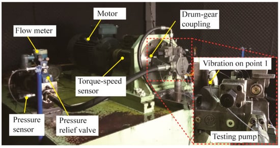 The testing rigs for the testing pump are shown in Figure 3. The testing pump is driven by an inverter-fed motor through the drum–gear coupling. A torque–speed transducer is used to monitor the torque and rotating speed, which is located between the testing pump and motor. The frequency converter can regulate the motor rotating speed. The discharge pressure is regulated by a pressure relief valve, and its maximum pressure is 35 MPa. The discharge pressure is measured by a pressure transducer and a pressure gauge. The pump output flow is measured by a flow transducer. The vibration signal is used for the piston wear fault detection and feature selection. The vibration acceleration on point 1 is collected by a piezoelectric accelerometer (Type LAN-XI 3050, Brüel & Kjær, Virum, Denmark) and data acquisition module (Type 4507-B-001, Brüel & Kjær, Virum, Denmark). The sampling frequency of vibration signals is 48,000 Hz. A high-pass filter is utilized to denoise raw vibration signals and the cut-off frequency is 7 Hz.