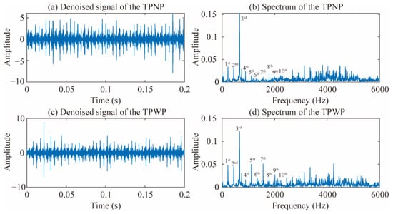 Denoised signals and the FT spectra. (a) Denoised signal of the TPNP; (b) spectrum of the TPNP; (c) denoised signal of the TPWP; (d) spectrum of the TPWP.