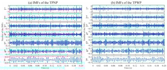 For the EEMD algorithm, the ratio of the standard deviation for the added sample noise is 0.2. The ensemble number is 50 and the IMF number is 7. The EEMD IMFs of the TPNP and TPWP are shown in Figure 6. The maximum amplitude of the seventh IMF of the TPNP is approximately 0.05, while the maximum amplitude of the seventh IMF of the TPWP is approximately 0.1. In addition, there are also some differences in the waveforms of the IMFs.