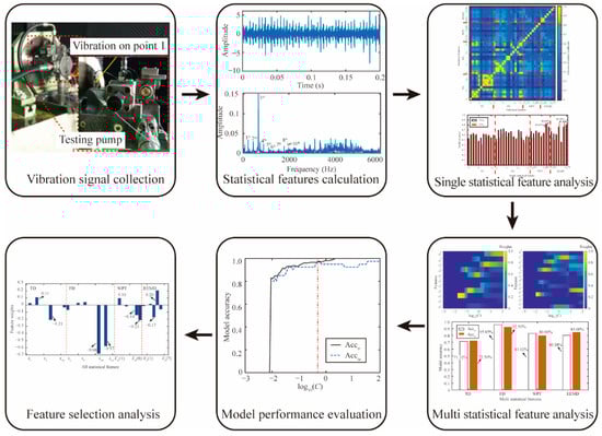 The improved SPARE-SVM-based methodology is proposed for the piston wear detection and feature selection of axial piston pumps. The flowchart of this methodology is shown in Figure 7. First, the vibration signals of the axial piston pump are collected by the data acquisition module. Second, a comprehensive set of features is defined in the TD, FD, and TFD. Third, single statistical feature analysis is conducted to investigate the feature correlations and model performance obtained from a single feature. Fourth, multiple statistical feature analysis is used to illustrate the weight variations and model performance of multiple features in the TD, FD, and TFD. Fifth, the weight variations and model accuracy of the large set of features are analyzed through the model performance evaluation. Lastly, feature selection analysis is utilized to validate the feature sparsity.