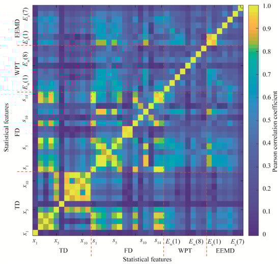 In terms of statistical features in the TFD, most features calculated by the WPT and EEMD have a lower correlation with each other due to frequency decompositions of the vibration signals. Therefore, statistical features with lower correlations in the TFD have better independence than features in the TD or FD.