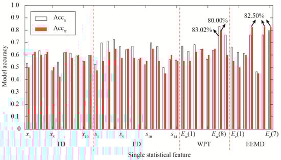 A single statistical feature is utilized as a model indicator for piston wear detection. The model accuracy of the training dataset (Acctr) and the testing dataset (Accte) is shown in Figure 9. Features Ee(4), Ee(6), and Ee(7) in the TFD yield better testing performance, with Accte of 82.50%. Feature Ew(7) has the best training performance, with the maximum Acctr of 83.02%. Moreover, the Accte of this single feature equals 80.00%. In addition, most features in the FD have better model accuracy than features in the TD. Features, s2, s3, s4, s5, s6, s7, s10, and s11 in the FD have larger Acctr values than features in the TD. A single feature of the energy ratio is able to capture the piston wear information. Results of the single statistical feature analysis show that a single feature in the TFD has better independence and model accuracy.