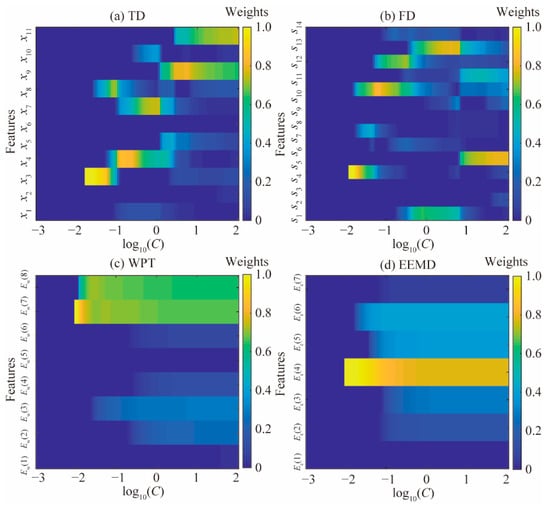 Weight variations of multiple features in the TD, FD, and TFD are shown in Figure 10. Abscissas are the logarithmic coordinates of parameter C. The parameter C ranges from 1.00 × 10−3 to 1.00 × 102, and it can adjust the weights of the square hinge loss function H2(~). Vertical coordinates refer to feature weights varying with parameter C during the piston wear detection process. Figure 10a shows that features x3, x4, x7, and x8 are the four first features selected by the multiple statistical feature analysis using the improved SPARE-SVM algorithm. These features are excluded as C increases. For features (x7, x8, x9, and x11), with strong correlations in the TD, only features x9 and x11 remain included when increasing parameter C. As shown in Figure 10b, features s5, s11, and s13 are selected among the multiple correlated features in the FD. Weight variations of multiple features calculated by the WPT are shown in Figure 10c. Ew(7) and Ew(8) are selected as the two first features and they remain included during the piston wear detection process. The three first selected features from the EEMD are Ee(4), Ee(5), and Ee(6), as shown in Figure 10d, and they continue to be selected as parameter C increases.