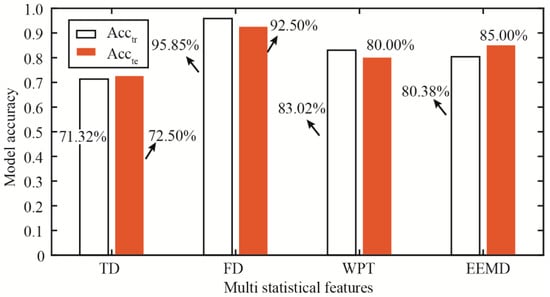 Multiple statistical features calculated from the TD, FD, WPT, and EEMD are employed as model indicators for piston wear detection, respectively. Moreover, the model accuracy Acctr and Accte is shown in Figure 11. Multiple features in the FD have the maximum model accuracy, where Acctr and Accte are 95.85% and 92.50%, respectively. Features in the TD have the minimum model accuracy, where Acctr and Accte are 71.32% and 72.50%, respectively. The Acctr and Accte for the WPT are 83.02% and 80.00%, respectively. Moreover, the Acctr and Accte for the EEMD are 80.38% and 85.00%, respectively. The model accuracy of multiple statistical features in the TFD is larger than that of features in the TD. Results show that piston wear detection based on multiple statistical features in the TD is not applicable. Features in the FD and TFD are effective compensations for the detection model. The model accuracy of features in the FD and TFD is higher and satisfactory.