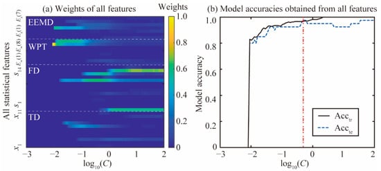 The model accuracy Acctr and Accte varying with parameter C during the model learning process is shown in Figure 12b. There is a sudden change in the model accuracy when C is around 9.11 × 10−3. The change is due to the fact that a large set of features in the TD, FD, and TFD is not selected during the model learning process when C is less than 9.11 × 10−3. The Accte increases as parameter C increases. The maximum value of the Accte of 97.50% occurs when C is around 4.75 × 10−1. Moreover, the Acctr is 96.60% at this time. The Accte is no longer improved as parameter C increases. In addition, when C is larger than 6.00 × 10−1, the Accte begins to decline. The model accuracy Acctr gradually increases as parameter C becomes larger, which means that over-fitting occurs in the model learning process. It is found that the parameter C is able to regulate the trade-off between the feature sparsity and model accuracy. Therefore, the optimal parameter C is chosen as 4.75 × 10−1 through the model performance evaluation. It is found that the model accuracy for all features is higher than that obtained from the single and multiple statistical feature analysis. This means that the model accuracy for all features is more satisfactory.