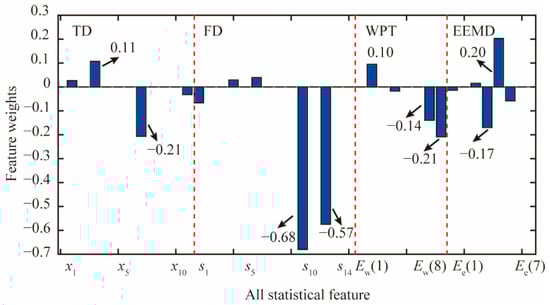 Considering that the classical SVM algorithm cannot complete the feature selection during the machine learning process, the feature selection analysis is only conducted based on the improved SPARE SVM algorithm. The weights of the large set of features in the TD, FD, and TFD with C = 4.75 × 10−1 are shown in Figure 13. Statistical features x1, x3, x7, x11, s1, s4, s6, s10, s12, Ew(2), Ew(4), Ew(7), Ew(8), Ee(1), Ee(3), Ee(4), Ee(5), and Ee(6) are selected by the improved SPARE-SVM algorithm. Meanwhile, features x2, x4, x5, x6, x8, x9, x10, s2, s3, s5, s7, s8, s9, s11, s13, s14, Ew(1), Ew(3), Ew(5), Ew(6), Ee(2), and Ee(7) are excluded with no weights. Features s10 and s12 in the FD have larger weights than other features. The weights of s10 and s12 are −0.68 and −0.57, respectively. The weights of the features x3 and x7 in the TD are 0.11 and −0.21, respectively. The weights of the features Ew(2), Ew(7), and Ew(8) calculated by the WPT are 0.10, −0.14, and −0.21, respectively. The weights of the features Ee(4) and Ee(5) calculated by the EEMD are −0.17 and 0.20, respectively. The order of the first six sparse features is s10, s12, Ew(8), x7, Ee(5), and Ee(4).