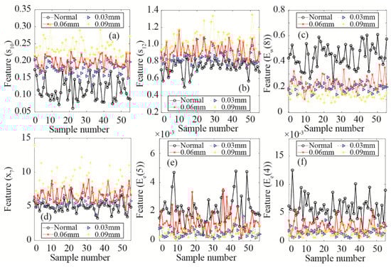 Different cases of additional clearance (0.03 mm, 0.06 mm, and 0.09 mm) are investigated to validate the six sparse features selected by the improved SPARE-SVM algorithm for piston wear detection. Feature comparisons under different cases of piston wear are shown in Figure 14. The abscissa is the sample number, and the sparse features of 55 samples are calculated. As shown in Figure 14a,b, different wear cases affect the convergence characteristics of the frequency spectrum power, especially for the root 2 order convergence index (s10) and 4 order convergence index (s12,). The indexes s10 and s12 become larger as the clearance increases. The case of the normal piston can be identified from the energy ratio features Ew(8), Ee(5), and Ee(4), as shown in Figure 14c,e,f, respectively. The case of 0.09 mm is different from the other three cases in terms of kurtosis (x7). The six major sparse features of the piston wear fault are s10, s12, Ew(8), x7, Ee(5), and Ee(4) due to the weight differences. Results show that the improved SPARE-SVM model is effective for piston wear fault detection and sparse feature selection.
