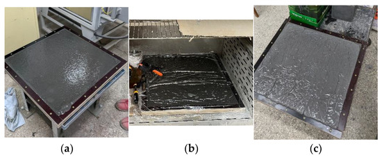 After mixing, the geopolymer composite was laid in plate molds and polymerized for 24 h at 75 °C. The polymerization process is shown in Figure 3.