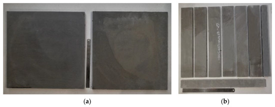 Geopolymer composite plate specimens before (a) and after (b) cutting.