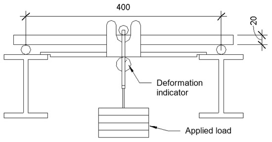 After this, flexural strength was determined, and the specimens were placed on a deflection creep stand and loaded with 40% of the ultimate flexural strength value. Placement into the deflection creep stand was according to the scheme in Figure 6. The actual specimen placement into deflection creep stand is shown in Figure 7.