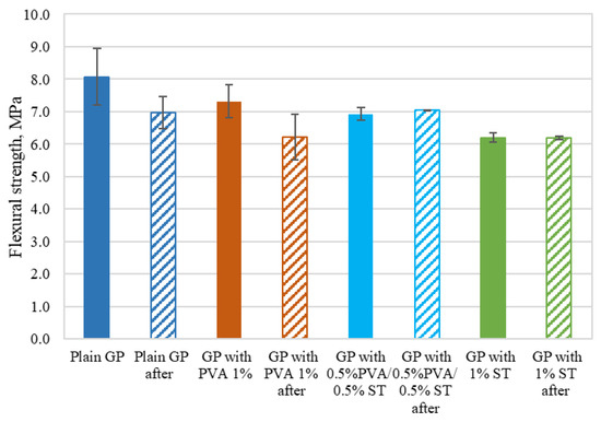 For all of the geopolymer composite mixes, the flexural values determines at the age of 28 days are higher than [21] the 28-day flexural strength values. Plain GP flexural strength is 14.1% higher than the highest flexural strength achieved in [21]. Still, it has to be noted that the specimen dimensions here and in [21] are different.