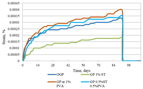 If we compare the results in Figure 11 with the long-term deflection results from [31], we can see that, unlike OPC mortar specimens that would exhibit hydration effects and show that autogenous and drying shrinkage have a leading effect over creep effects, the GP specimens do not show such an effect. Furthermore, the long-term strains for the GP are 0.8% from the flexural strength registered to OPC mortar specimens tested at an early age. In their study, Un et al. [21] presented long-term deflection of composite geopolymer beams, and there is visible close relation with the Figure 11 curves. Furthermore, it is clear that when specimens reach the age of 100 days (in Figure 11, day 72), the creep strains stop generating and stabilize.