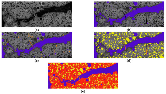 Geopolymer specimen reinforced with 0.5% PVA/0.5% steel fibers after long-term and bending strength test image dividing sequence from raw image (a) to air voids (b), added reinforcement (c), and filler (d) and matrix (e) in 25-times magnification. The image area is 20 mm high and 75 mm wide.