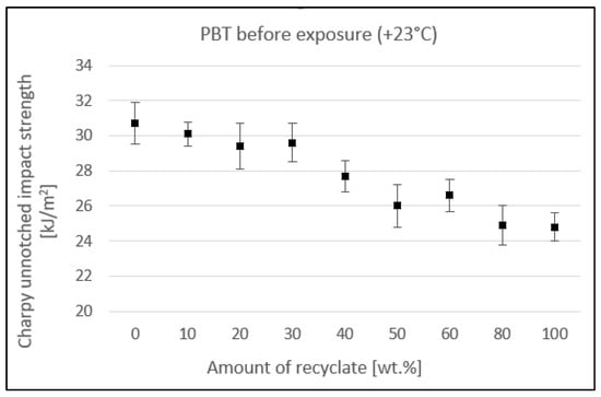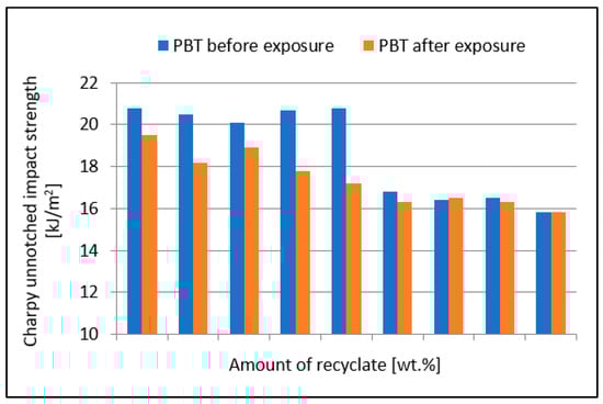 Based on the evaluation of the PBT composite before the specimens were exposed to elevated temperature, it can be concluded that the concentration of the recycled material in the virgin material only affects the values of the unnotched impact strength of the PBT composite when the recycled material accounts for at least 50 wt.%.