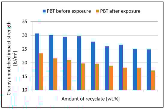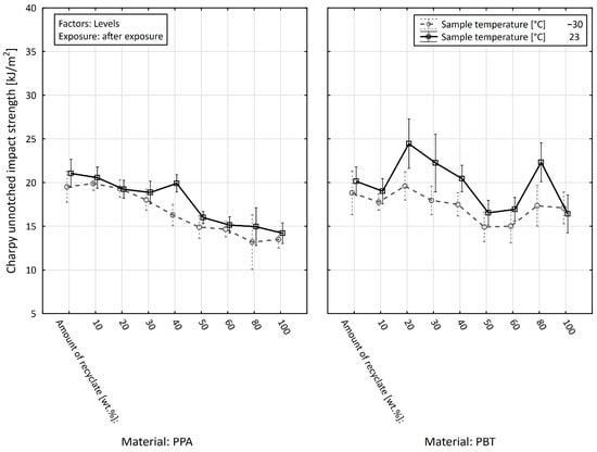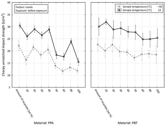 Finally, we analyzed the effect of the material (PPA or PBT) on the impact test value of the unnotched impact strength, acU (kJ·m−2), depending on the amount of recycled material, the specimen temperature, and the exposure, with the exposure being the dividing factor (Figure 15 and Figure 16).