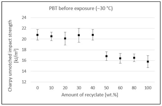 Dependence of the unnotched impact strength of PBT on the amount of recycled material before the samples were exposed to elevated temperature (−30 °C).
