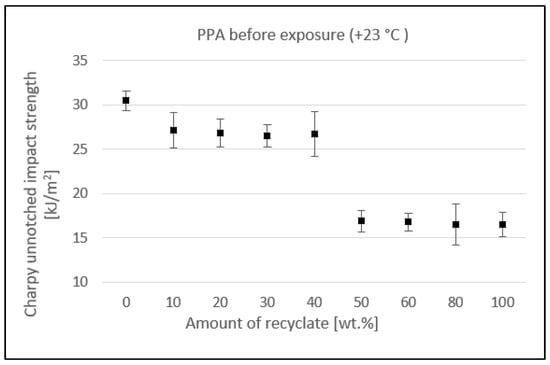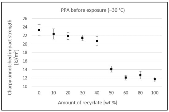Dependence of the unnotched impact strength of PPA on the amount of recycled material before the samples were exposed to elevated temperature (−30 °C).