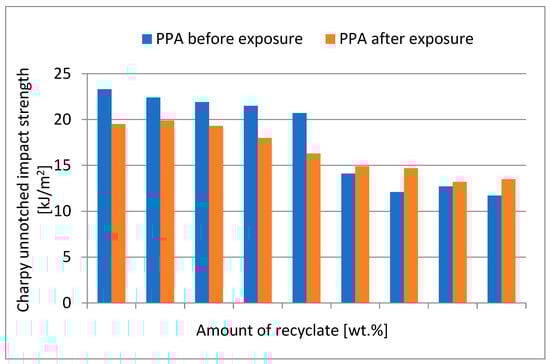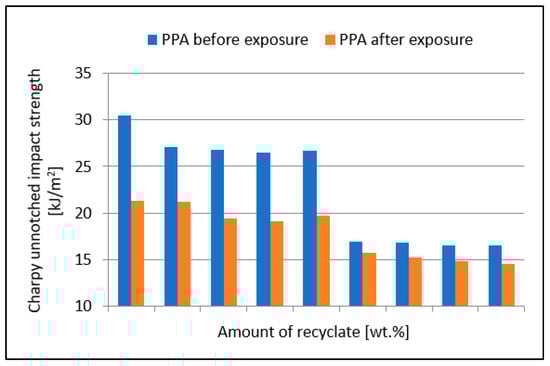 Based on the evaluation of the PPA composite before the specimens were exposed to elevated temperature, it can be concluded that the concentration of the recycled material in the virgin material only affects the values of the unnotched impact strength of the PPA composite when the recycled material accounts for at least 50 wt.%.